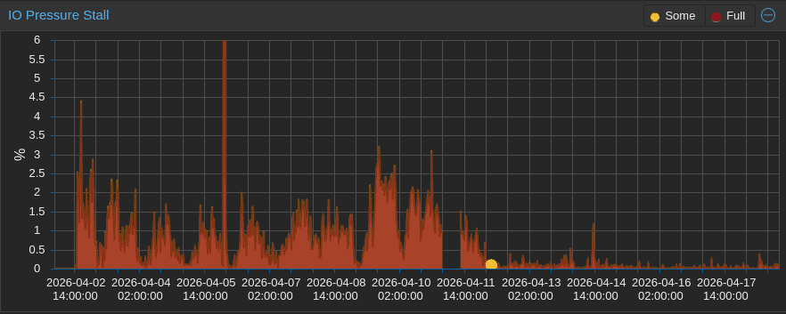 The beneficial effect of the additional RAM is even more evident in the I/O pressure graph, which shows the percentage of time "wasted" waiting for the disks to become available.